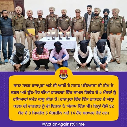 Collaborative Triumph: PS Sadar Rajpura and CIA Staff Patiala Police join forces to apprehend 5 individuals from a notorious murder and robbery gang. Their arrest, including recovery of 3 pistols, 5 magazines, and 14 rounds, brings justice for the blind murder of a doctor in Rajpura.